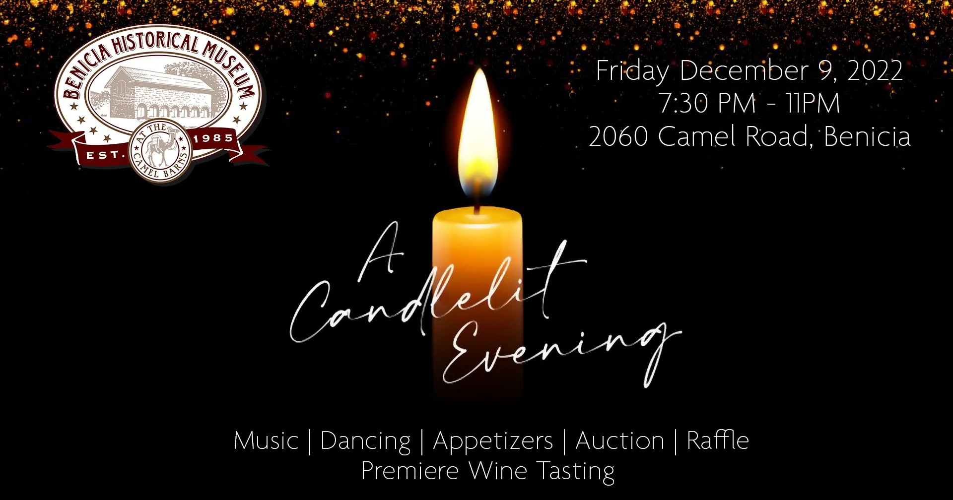 The Benicia Historical Museum invites you to an evening of candlelight, wine, and delicious appetizers. Groove to the sounds of Dennis Dove in the museum’s Stone Hall and enjoy the cool Christmas vibe in the Camel Lounge while mingling with friends.