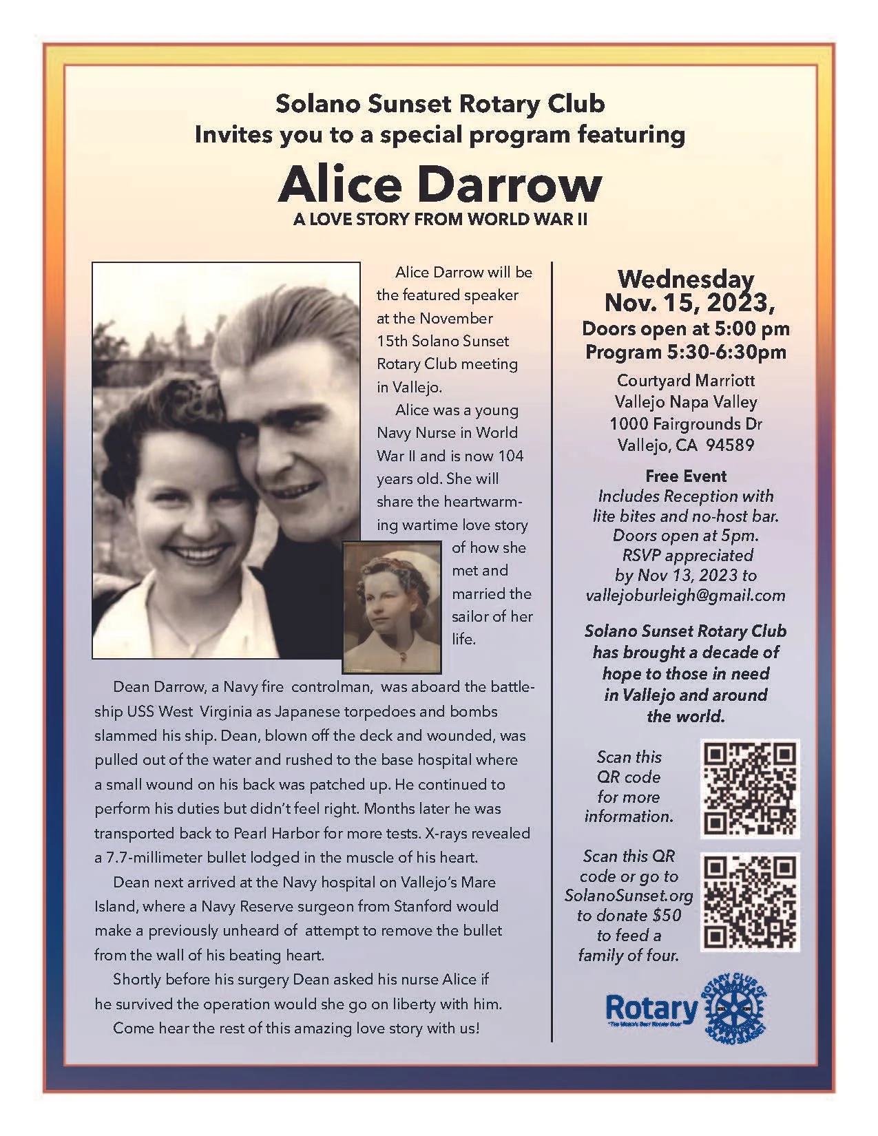 Alice Darrow will be the featured speaker at the November 15th Solano Sunset Rotary Club meeting in Vallejo. Alice was a young Navy Nurse in World War II and is now 104 years old. She will share the heartwarming wartime love story of how she met and married the sailor of her life.