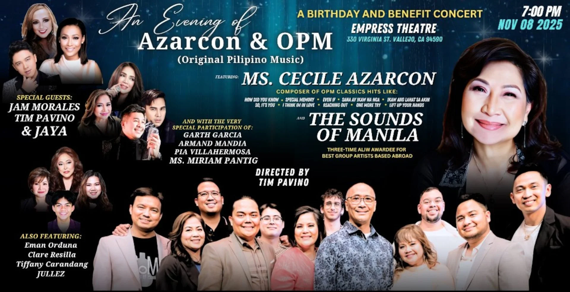 Join us for a special Birthday Benefit Concert celebrating the timeless hits of legendary songwriter Cecile Azarcon and beloved Original Pilipino Music (OPM) classics, featuring the Sounds of Manila Band and an all-star lineup of Filipino talent!