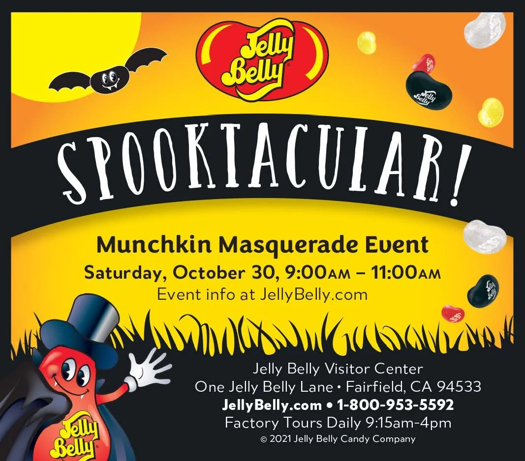 Munhkin Masquerade Saturday, October 30, 2021 9:00 AM 11:00 AM Jelly Belly Factory 1 Jelly Belly Lane Fairfield, CA, 94533 United States (map) Google Calendar ICS Join us for our annual Munhkin Masquerade event. 9:00am-11:00am on Saturday, October 30th. With your hosts Mr. Jelly Belly and Kelly the Clown! Treat bags available for the first 300 kids and Costumes are encouraged!