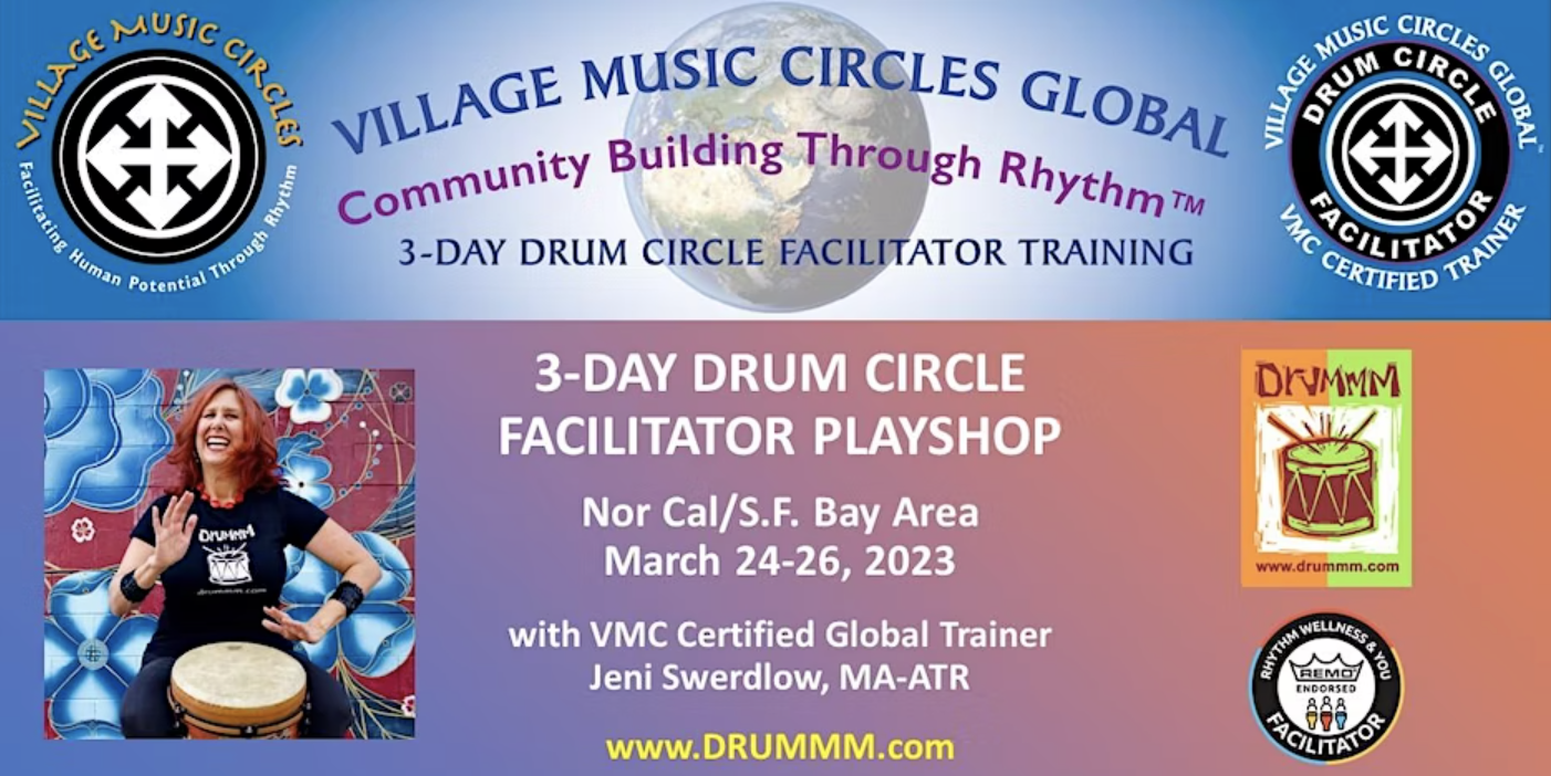 Village Music Circles™ Basic Facilitator Training (aka "Playshop") will empower you to build a rhythm community while exploring the foundational elements of drum circle facilitation.