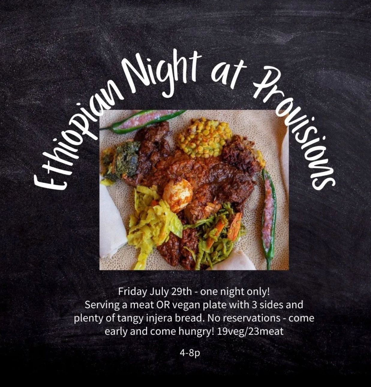 Ethopian Night at Provisions Friday, July 29, 2022 4:00 PM 8:00 PM Provisions 300 Virginia Street Vallejo, CA, 94590 United States (map) Google Calendar ICS Don’t miss out on this one-night-only event! Enjoy your choice of a meat or vegan plate with 3 sides and plenty of tangy injera bread. No reservations, come early and come hungry!