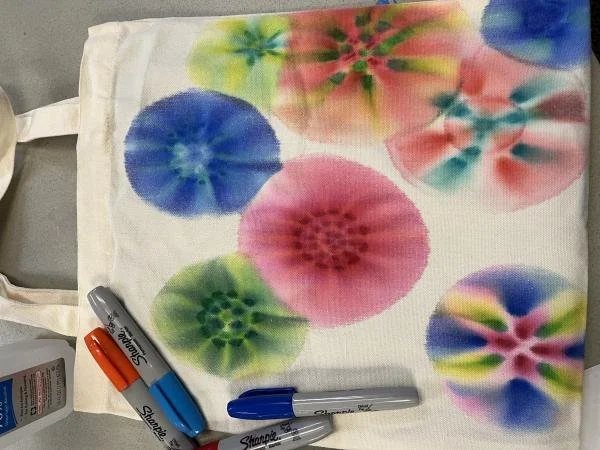 Create tie dye looks using permanent markers and customize a tote bag to keep.