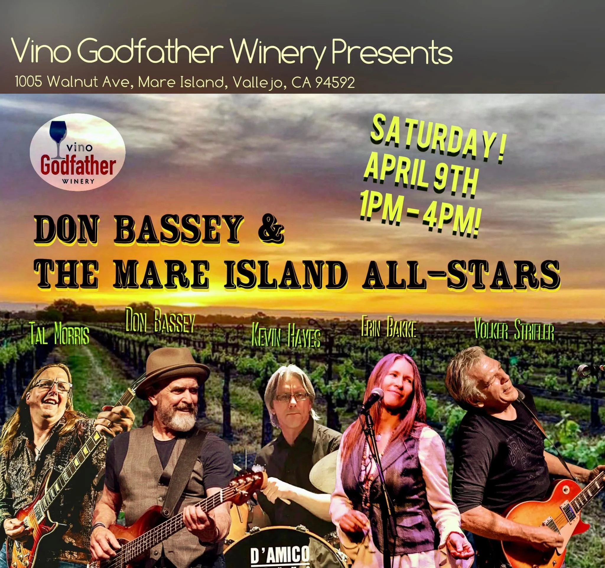 Don Bassey along Tal Morris and Volker Strifler, Kevin Hayes, Erin Bakke, and Don Bassey make up the Mare Island All-Stars at Vino Godfather.