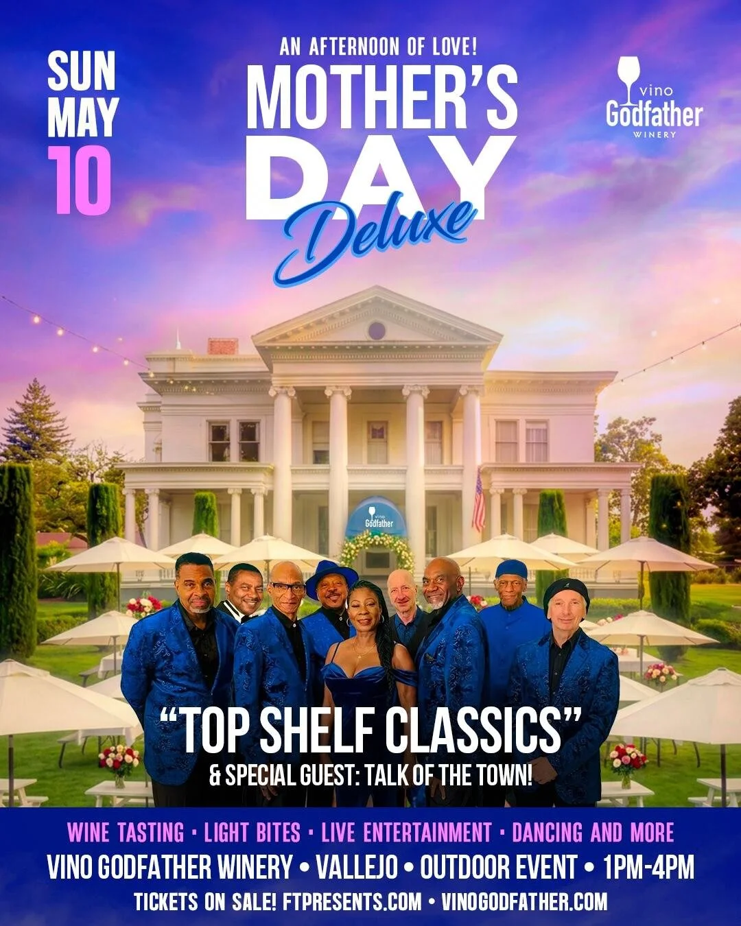 Top Shelf and Talk of the Town are coming together to deliver a special Mother's Day concert at Vino Godfather Winery. Bring food, flowers, and your moms to this exciting event. There will also be lots of wine, bubbly, and food available to purchase. This exciting afternoon performance will be a soulful mix of 60's Motown, Old School '70s, Retro '80s-90's, Classic Soul, and R&B. Bring the whole family to share in an afternoon of love at Vino Godfather Winery on Mare Island.