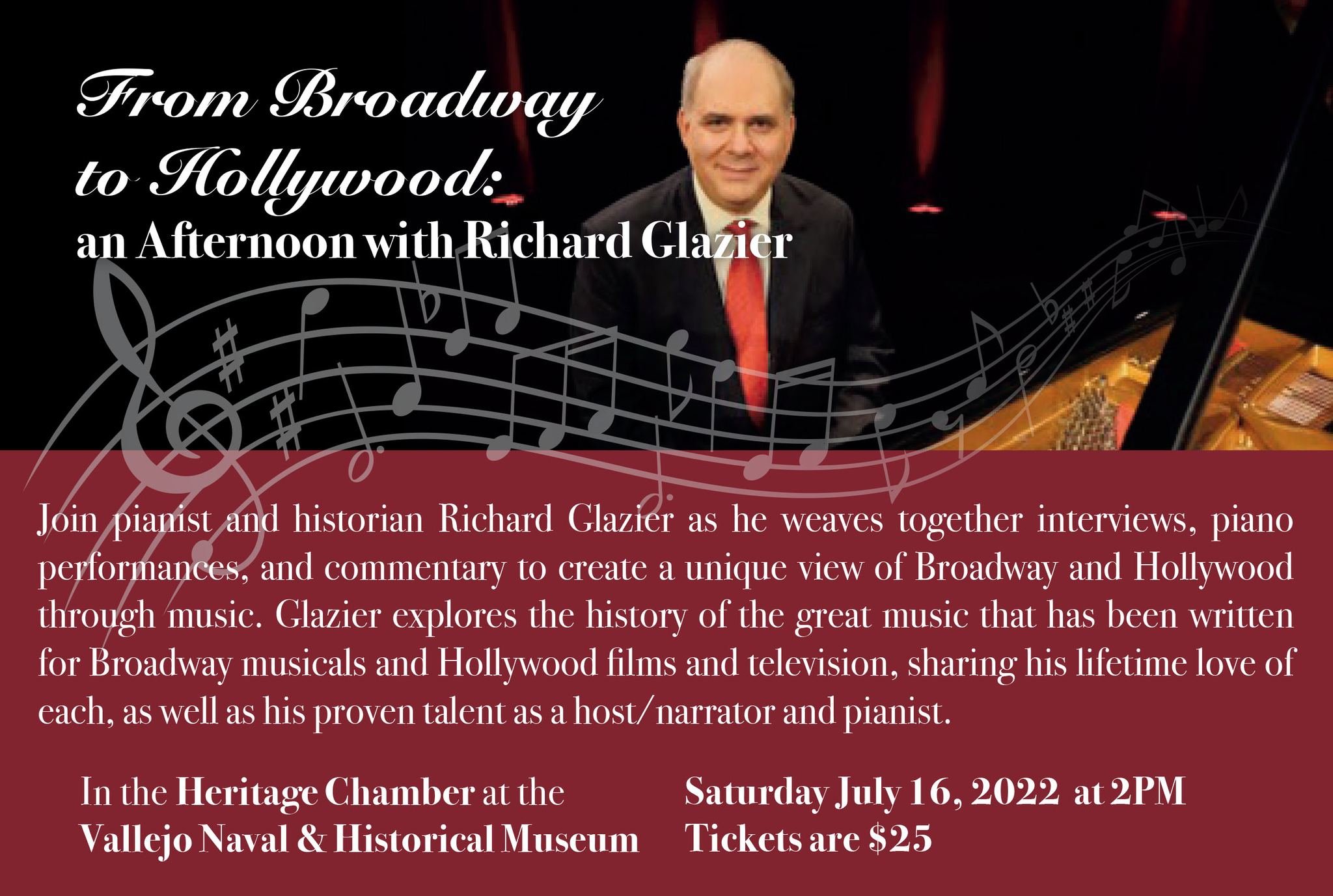 From Broadway to Hollywood– Join pianist and historian Richard Glazier as he weaves together interviews, piano performances, and commentary to create a unique view of Broadway and Hollywood through music. Glazier explores the history of the great music that has been written for Broadway musicals and Hollywood films and television, sharing his lifetime love of each, as well as his proven talent as a host/narrator and pianist at the Vallejo Naval and Historical Museum.