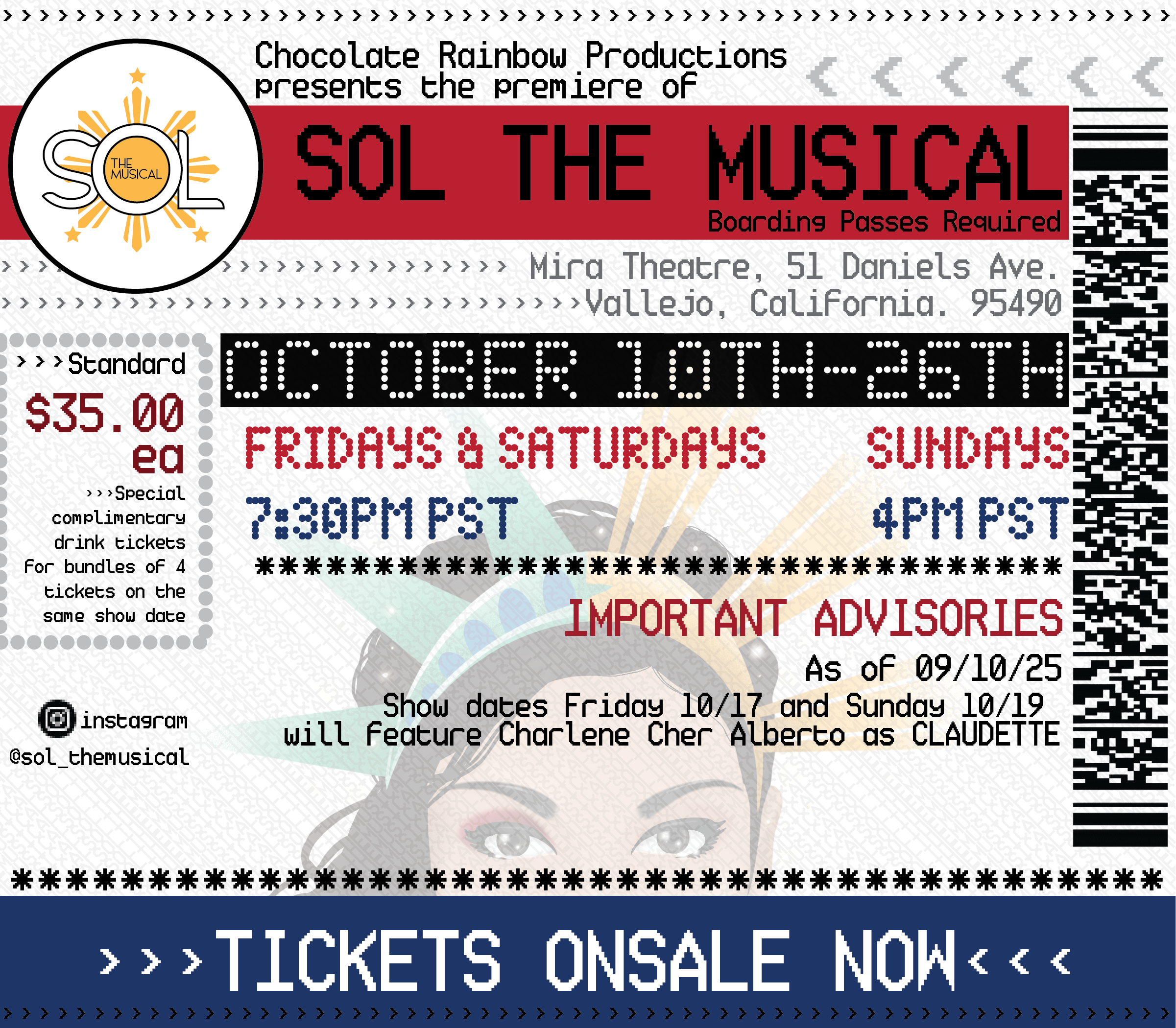 * Show dates Friday 10/17 and Sunday 10/19 will feature Charlene Cher Alberto as Claudette*