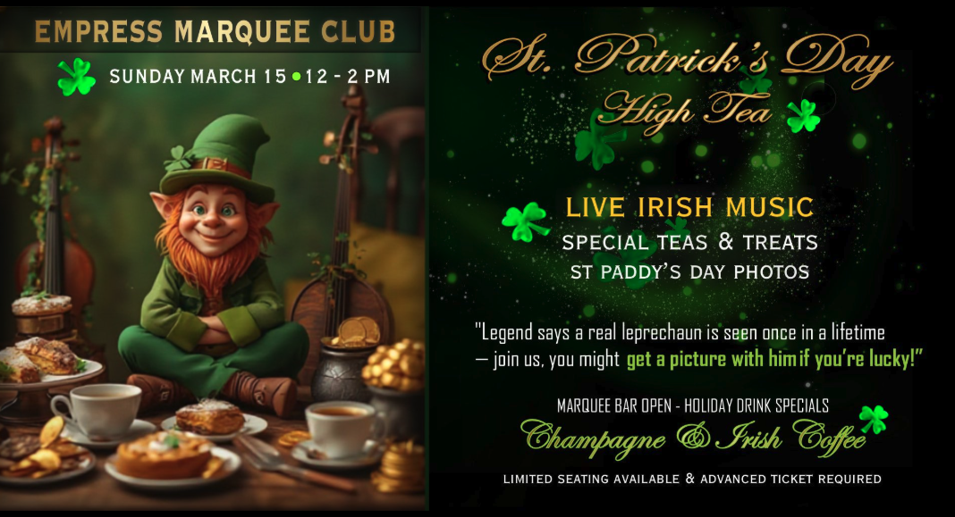 Join us for a cozy and elegant St. Patrick’s Day celebration at the Empress Marquee Club.