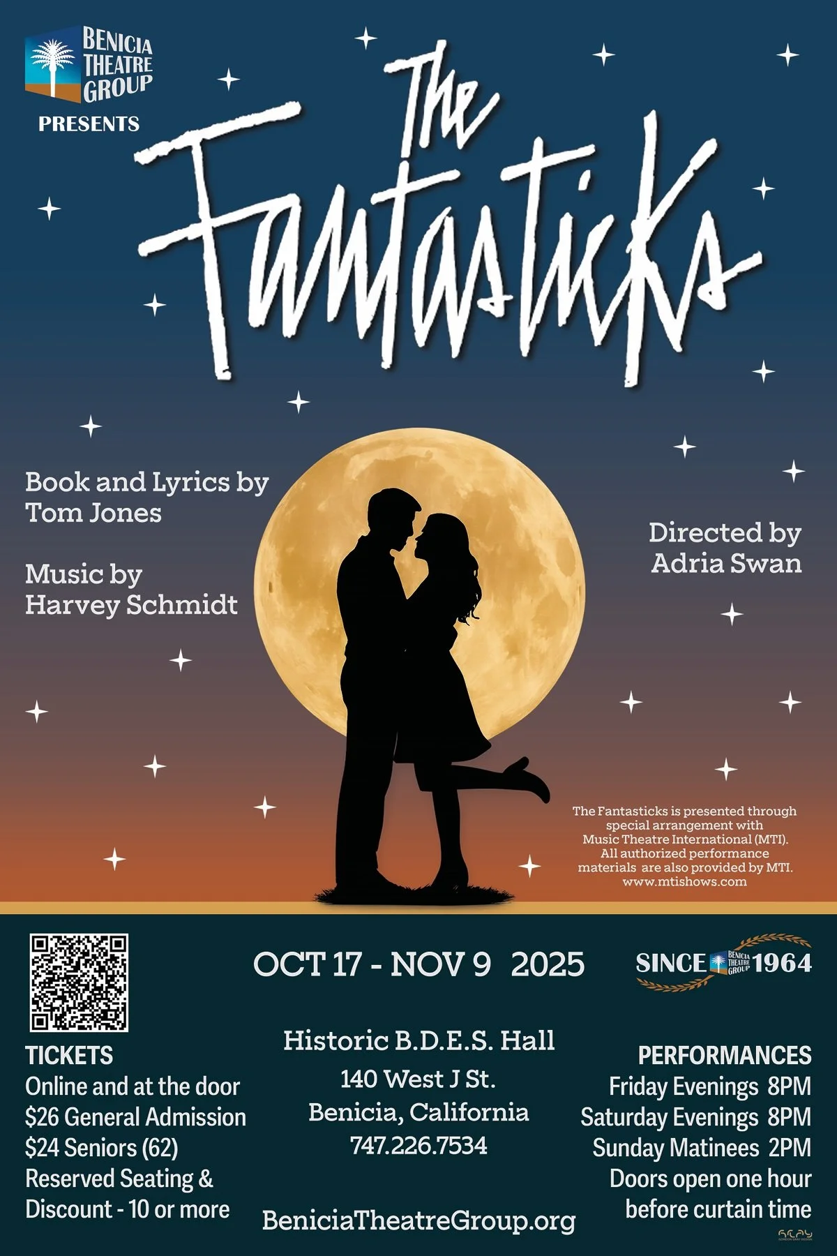 The magic of love, laughter, and lyrical storytelling returns to Benicia this fall as Benicia Theatre Group proudly presents the timeless musical The Fantasticks, running October 17 – November 9, 2025, at the historic B.D.E.S. Hall in downtown Benicia.