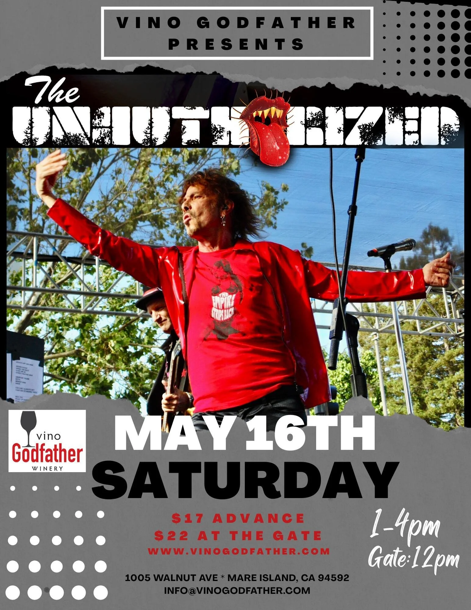Misc: Gate opens at noon. Minors welcome, kids 12 and under are free. Well mannered and managed puppy dogs allowed in our outdoor venue. We will have seating for everyone. Your own comfy folding chairs are welcome. *You may bring your own water and "light snacks."