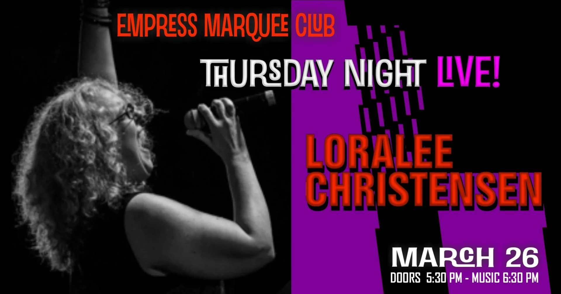 Back to All Events Thursday Night Live: Loralee Christensen Thursday, March 26, 2026 6:30 PM 8:30 PM Empress Marquee Club 330 Virginia Street Vallejo, CA, 94590 United States (map) Google Calendar ICS get tickets