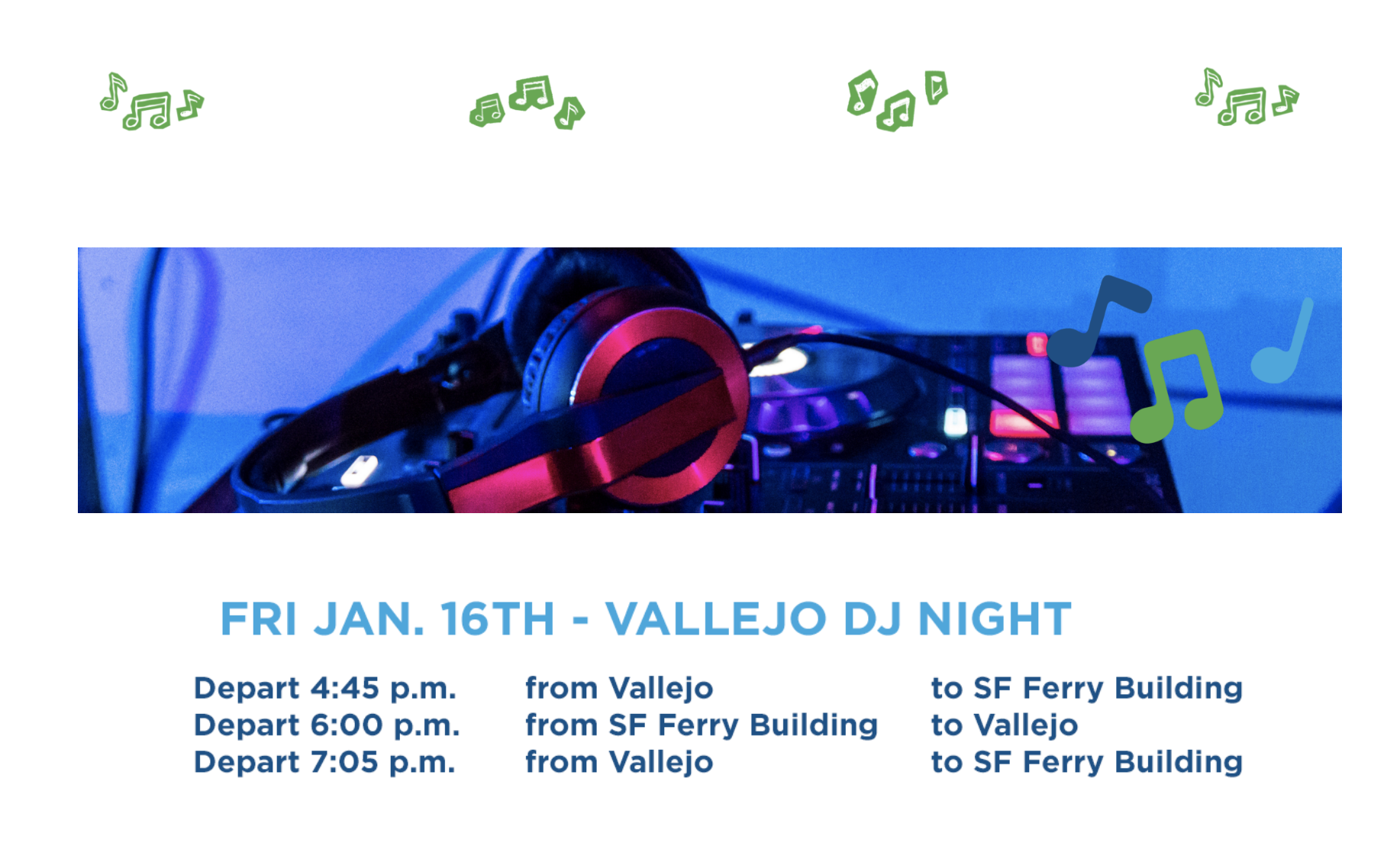 Back to All Events Tides & Tunes on SF Bay Ferry Friday, January 16, 2026 4:45 PM 7:05 PM On Board the Vallejo/San Francisco Route 289 Mare Island Way Vallejo, CA, 94590 United States (map) Google Calendar ICS Start your year off with free entertainment onboard SF Bay Ferry this January! Sail the San Francisco Bay to live DJ sounds, sweeping skyline views, and an all-ages, feel-good vibe that turns the journey itself into the experience.Event website