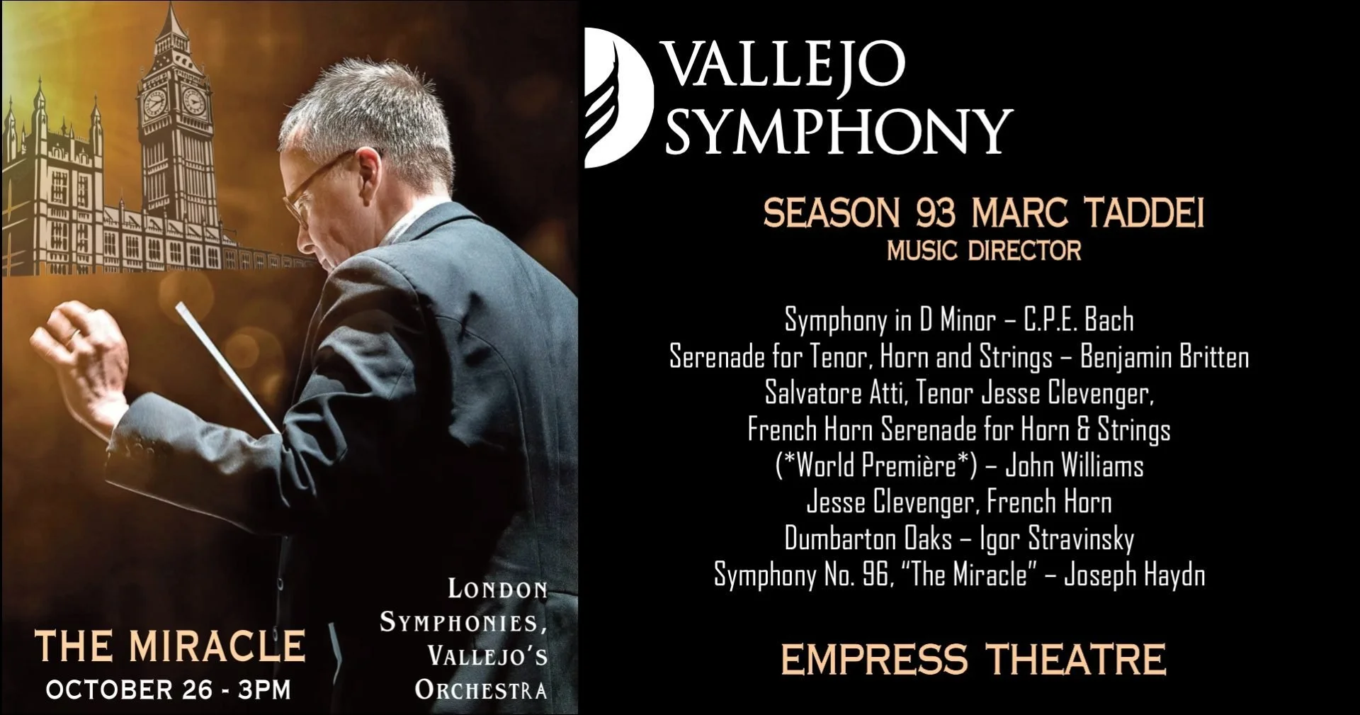 CPE Bach, Symphony in D minor Britten, Serenade for Tenor, Horn and Strings Salvatore Atti (tenor) Jesse Clevenger (French horn) WORLD PREMIERE John Williams, Serenade for Horn and Strings Stravinsky, Dunbarton Oaks Haydn, Symphony No. 96 The Miracle