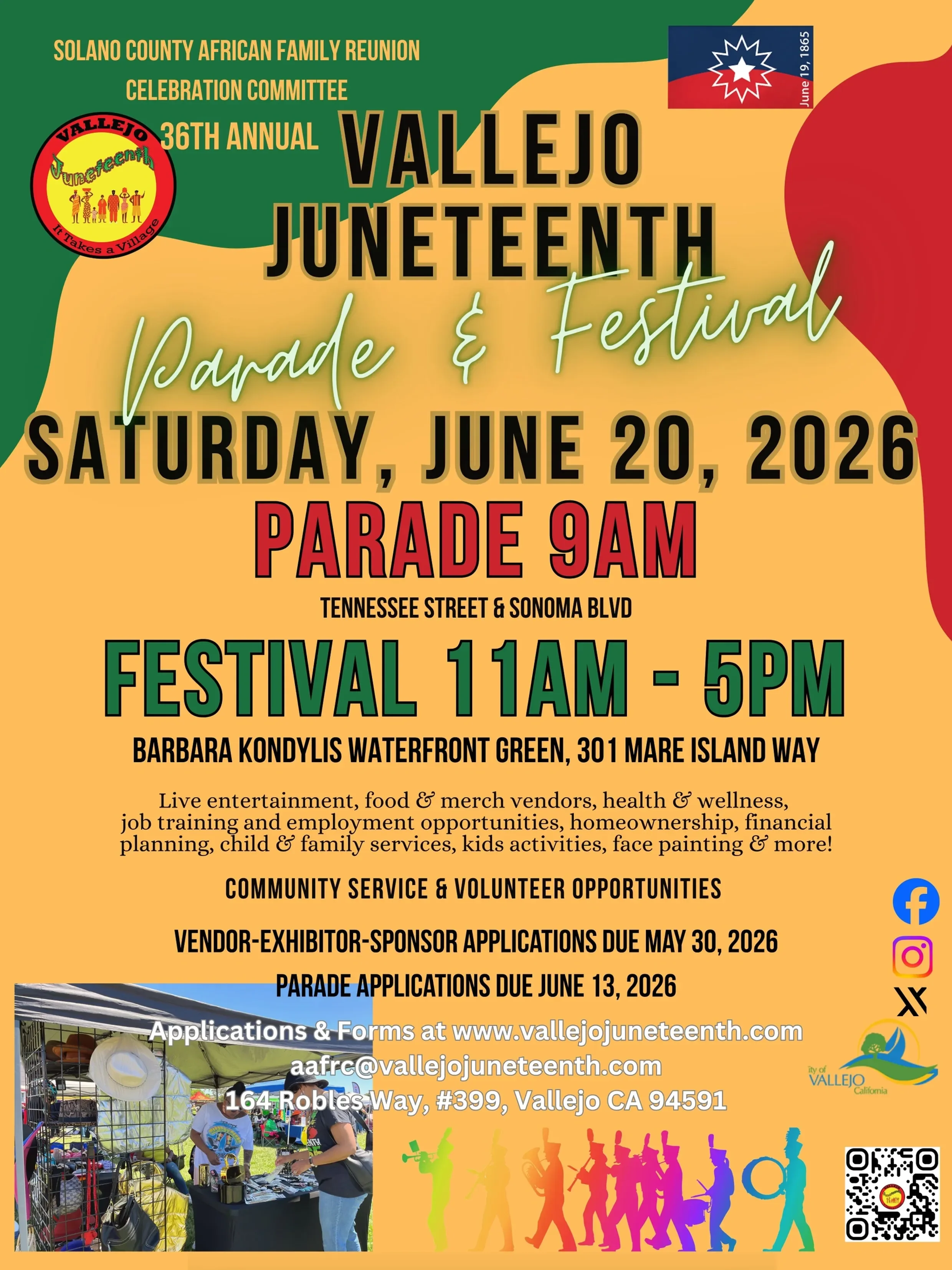 Back to All Events Vallejo's Juneteenth Parade & Festival Saturday, June 20, 2026 9:00 AM 5:00 PM Barbara Kondylis Waterfront Green 301 Mare Island Way Vallejo, CA, 94590 United States (map) Google Calendar ICS Learn more Learn more Parade: 9amFestival: 11am-5pmLive entertainment, food & merch vendors, health & wellness, Job training and employment opportunities, homeownership, financial planning, child & family services, kids activities, face paining & more!