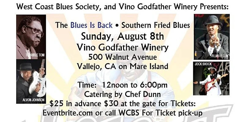 The West Coast Blues Society and Vino Godfather Winery presents the Annual Southern Fried Blues and Wine Fundraiser for our Oakland Blues Walk of Fame and Blues In The Schools The West Coast Blues Society presents an annual fundraiser with award winning bands and special guests from Northern California. All styles of blues and some Southern Food will be presented. Featuring: Terrible Tom, Fillmore Slim & Alvon!