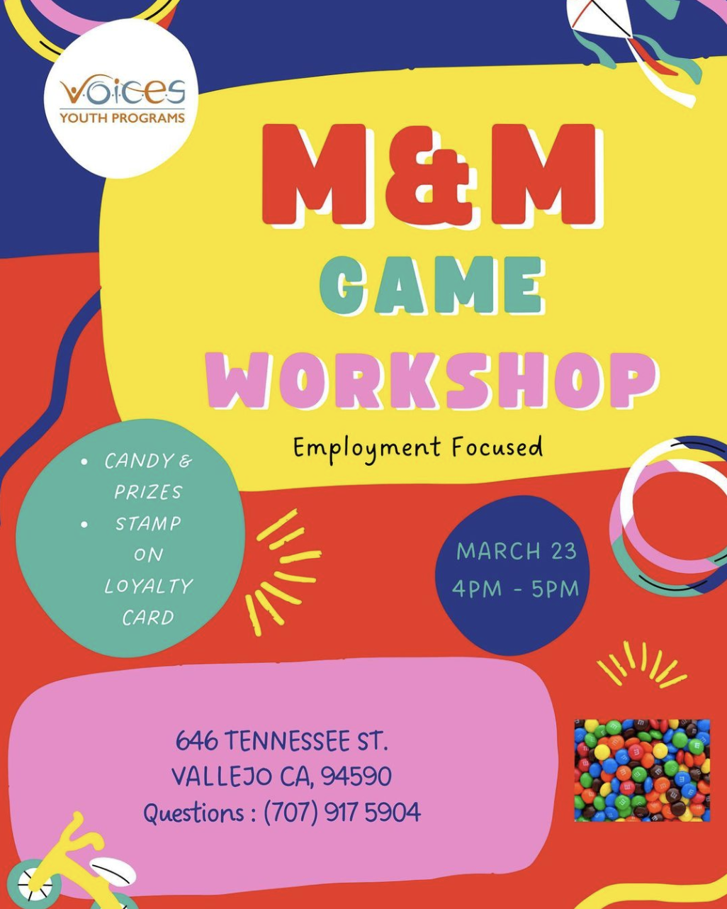 Voices Solano Employment Workshop Game Thursday, March 23, 2023 4:00 PM 5:00 PM Voices Solano 646 Tennessee Street Vallejo, CA, 94590 United States (map) Google Calendar ICS Voices Solano Employment Workshop GameFREE Community Event! A fun interactive game where youth ages 14-26 can speak & learn about navigating employment through conversation with other peers Point of Contact: Quora Epps, quora@voicesyouthcenter.org Website Instagram
